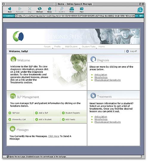 With the Student Management Center, speech language pathologists can: customize interactive speech therapy home programs for students; manage caseloads; and track students’ progress. Speech language pathologists can also access both treatment and educational material and communicate with colleagues with the online forum.